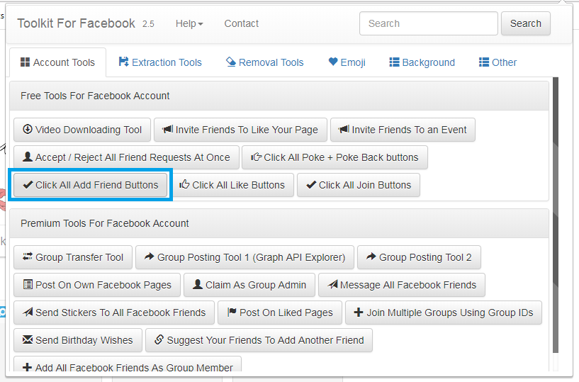 Langkah Ketiga: Buka add ons Toolkit for Facebook, kemudian pada tab Account Tools pilih Click All Add Friend Buttons. Anda akan diredirect ke halaman friend request facebook bila tidak dialihkan ke halaman friend request klik disini.