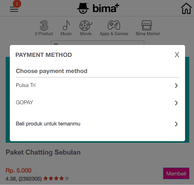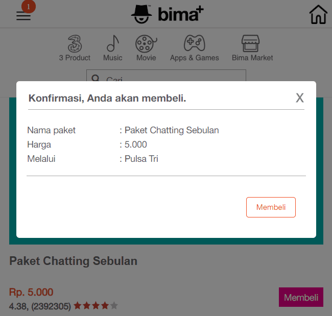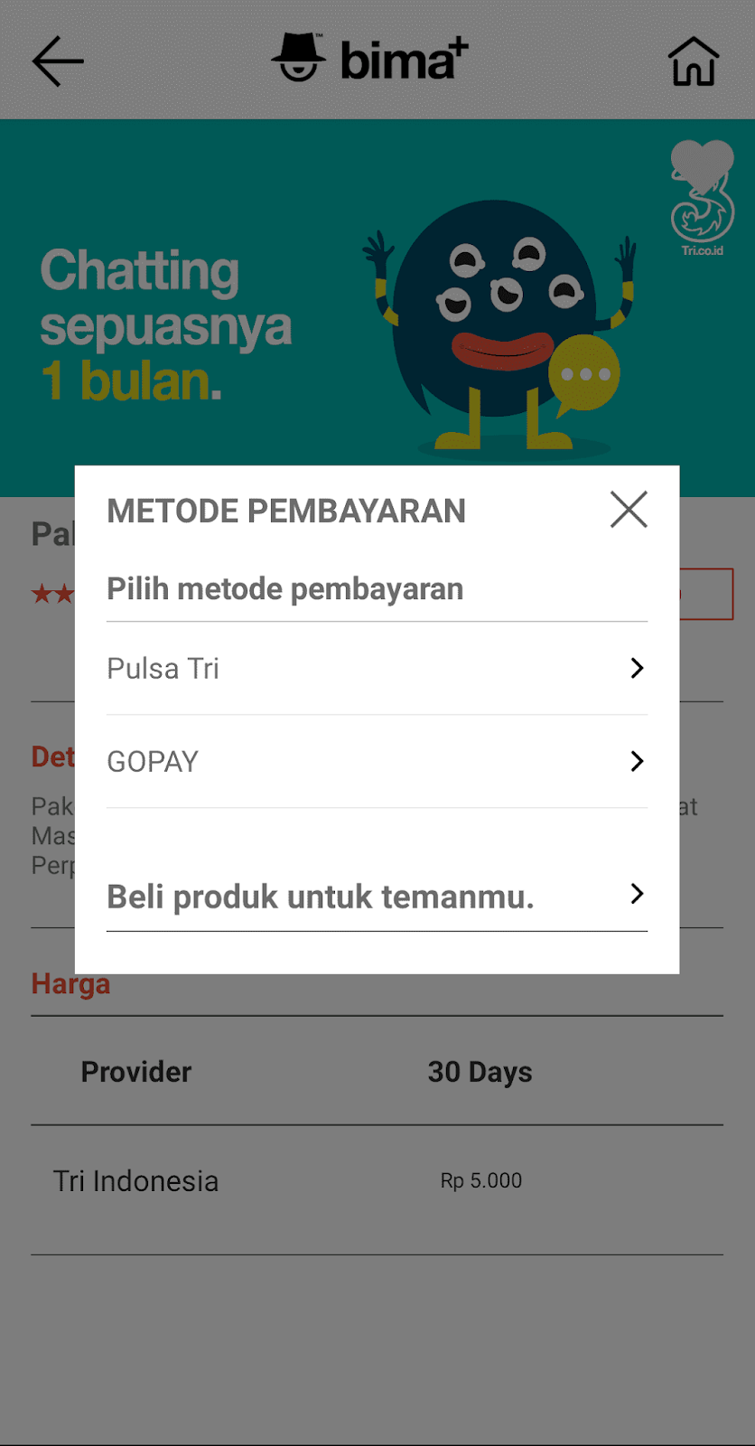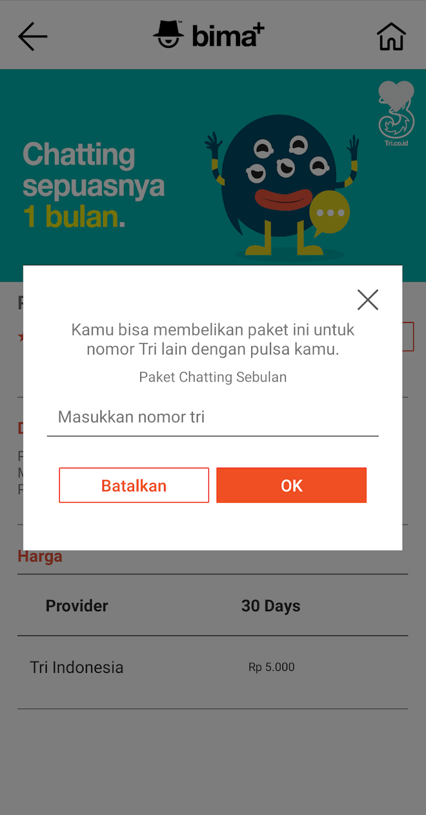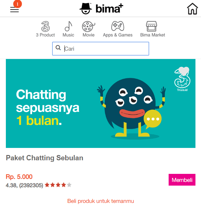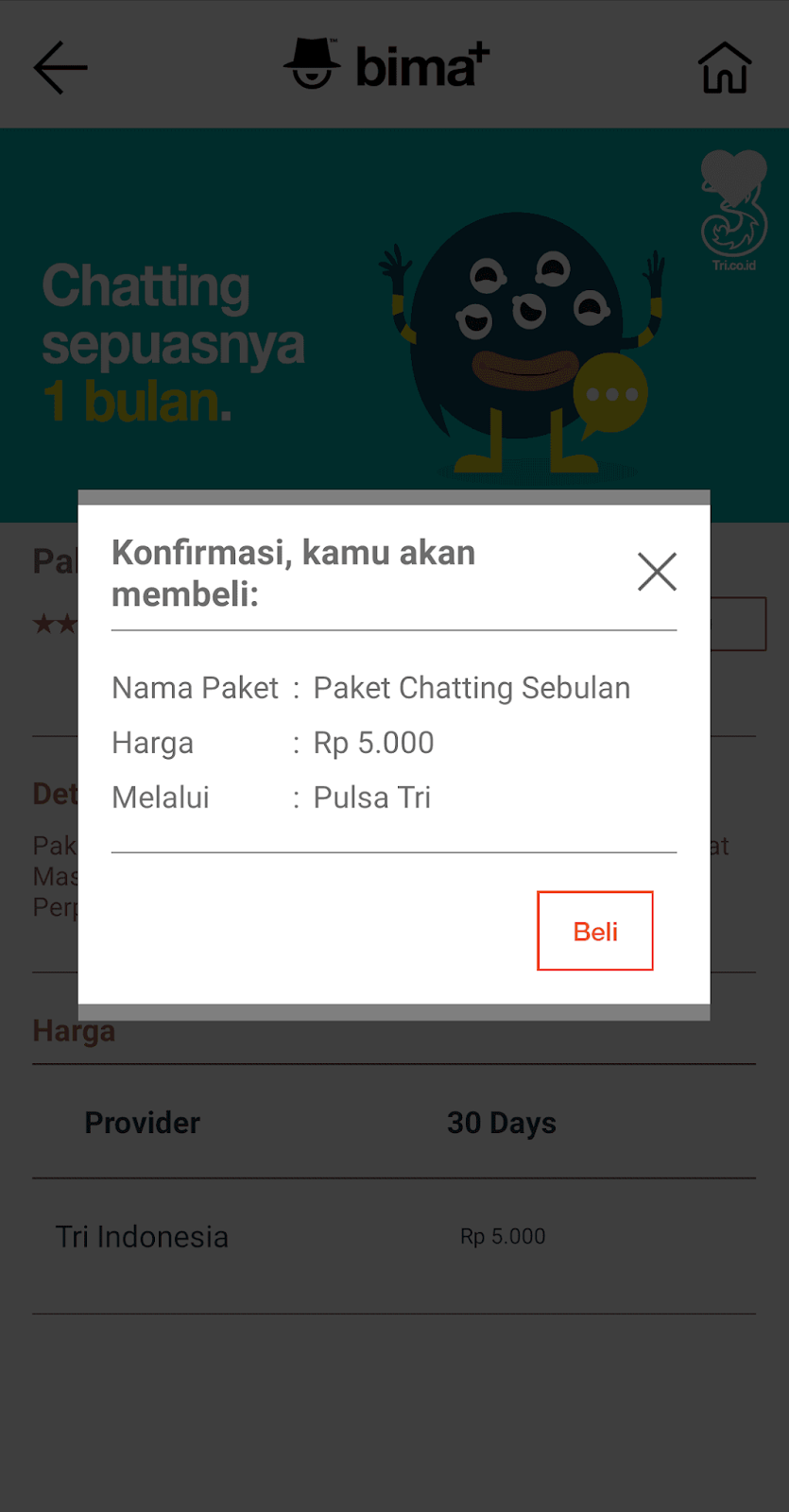 Cara beli paket chat sebulan Tri yang pertama dapat dilakukan melalui aplikasi bima+.